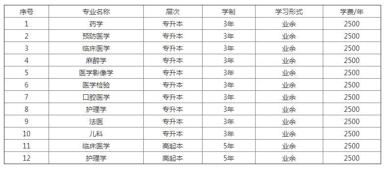 繼續(xù)學(xué)歷教育高起本層次設(shè)有臨床醫(yī)學(xué)、護(hù)理學(xué)等2個(gè)專業(yè);專升本層次設(shè)有臨床醫(yī)學(xué)、護(hù)理學(xué)、醫(yī)學(xué)影像學(xué)、醫(yī)學(xué)檢驗(yàn)、麻醉學(xué)、口腔醫(yī)學(xué)、藥學(xué)、藥物制劑、預(yù)防醫(yī)學(xué)、法醫(yī)學(xué)、生物技術(shù)、生物工程、生物醫(yī)學(xué)工程、應(yīng)用心理學(xué)、公共事業(yè)管理、信息管理與信息系統(tǒng)等16個(gè)專業(yè)。