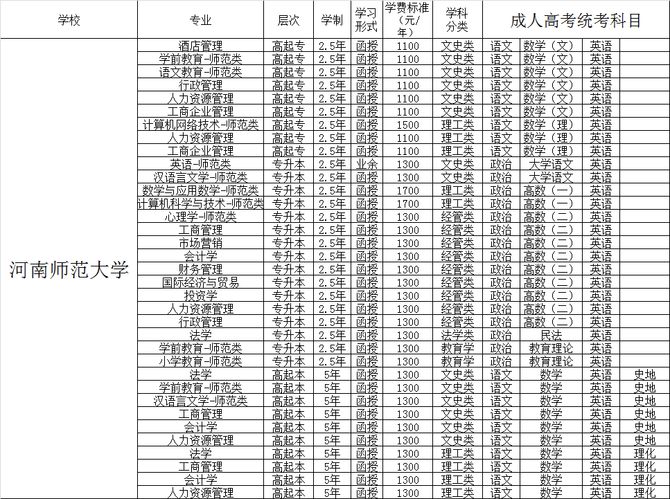 河南師范大學(xué)成人高考招生專業(yè)匯總: