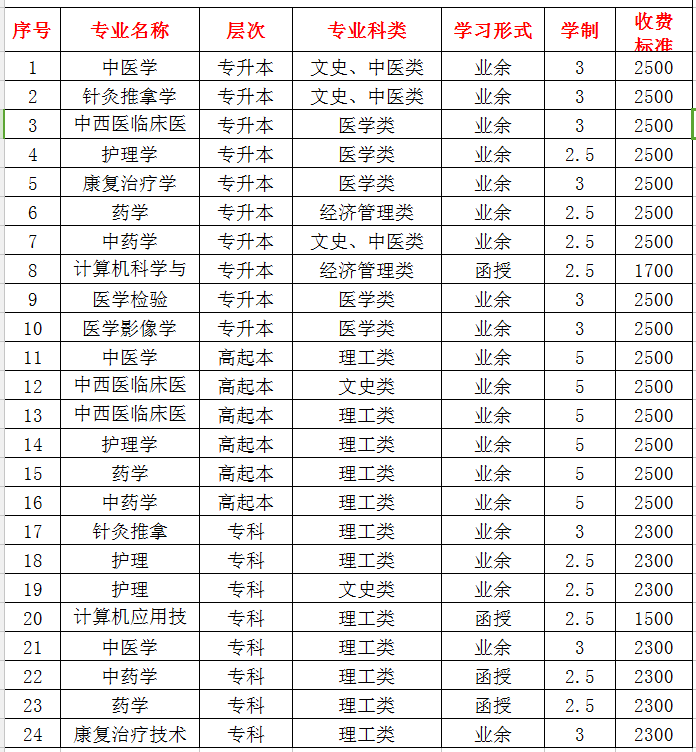 河南中醫(yī)學院成考專升本招生專業(yè)
