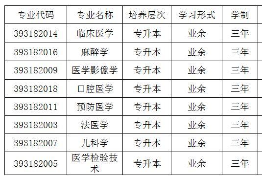 學(xué)校 2008 年成人高等教育設(shè)有臨床醫(yī)學(xué)、護(hù)理學(xué)、醫(yī)學(xué)影像學(xué)、醫(yī)學(xué)檢驗(yàn)、麻醉學(xué)、口腔醫(yī)學(xué)、藥學(xué)、預(yù)防醫(yī)學(xué)、法醫(yī)學(xué)、應(yīng)用心理學(xué)和公共事業(yè)管理等 11 個(gè) 本科專業(yè);設(shè)有臨床醫(yī)學(xué)、護(hù)理、醫(yī)學(xué)檢驗(yàn)技術(shù)、醫(yī)學(xué)影像技術(shù)、口腔醫(yī)學(xué)、麻醉學(xué)、康復(fù)治療技術(shù)、藥學(xué)、公共衛(wèi)生管理等 9 個(gè)??茖I(yè)。為適應(yīng)不同層次人員的學(xué)習(xí)需求,開辦有業(yè)余本科 ( 含高起本、專升本)、業(yè)余??苾煞N辦學(xué)層次。